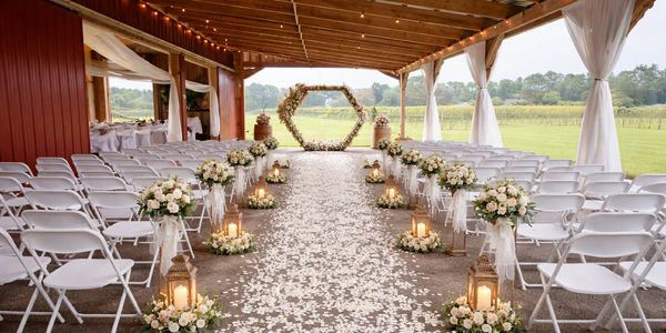 This ceremony location is adjacent to the barn with the vineyard backdrop.