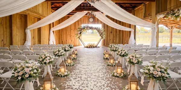 Reception area for DJ and dancing located inside the barn leading to an outdoor space and with bistro lighting. Dinner seating is centrally located between reception area and ceremony with white drapes and two chandeliers. Barn doors open up to catch the beautiful sunset views. Includes new luxury toilet trailer.